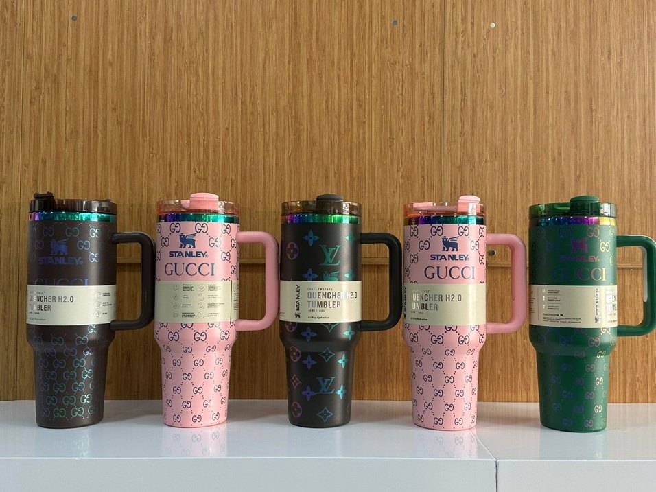 Renkli, pembe ve siyah Gucci ile Louis Vuitton desenli kulplu ve kapaklı muglar. ☕