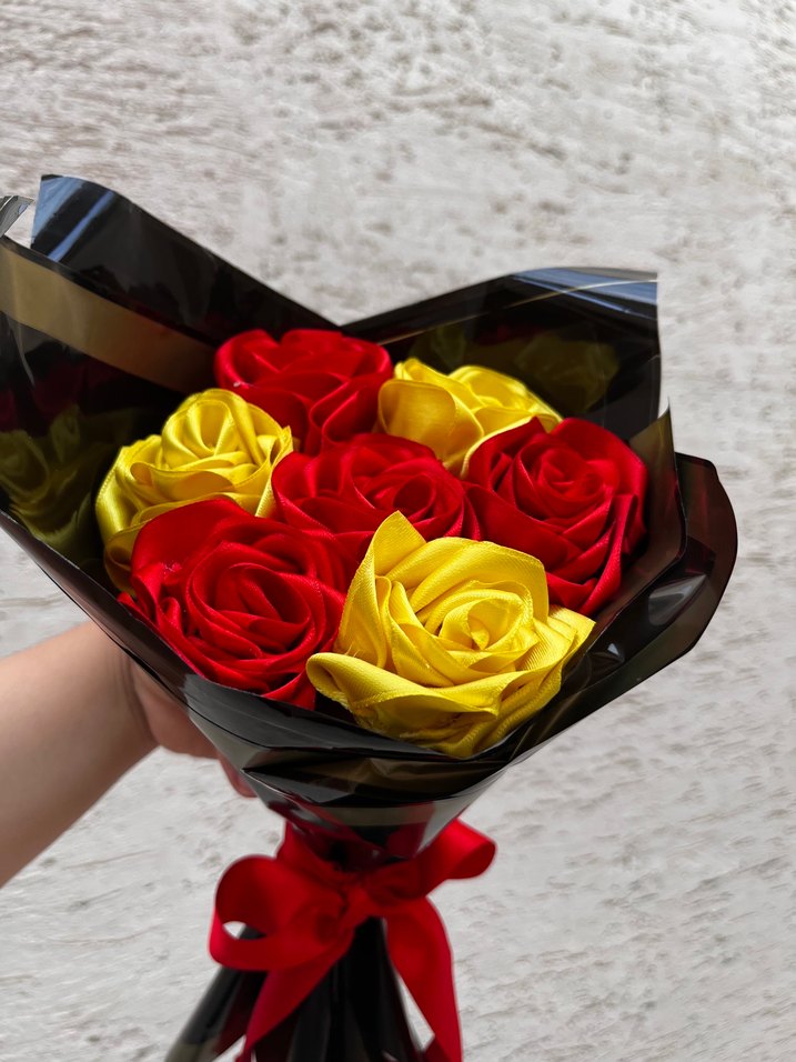 Kırmızı ve sarı güller siyah kağıda sarılı, kırmızı kurdeleli renkli bir buket. 7li Cimbom buketi