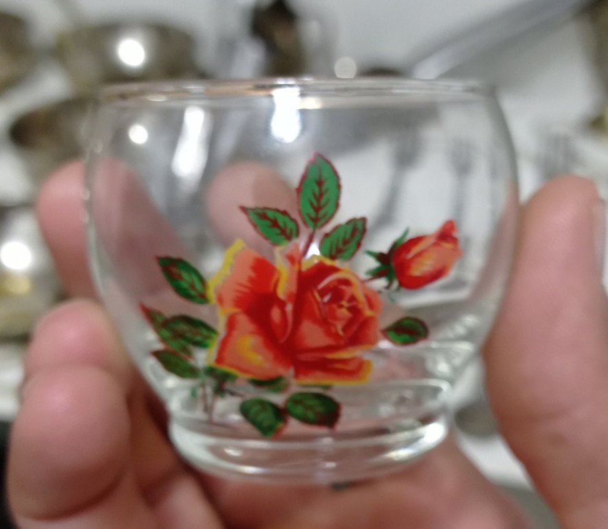 antika dekorluk ve romantik havası olan nostalji..Canlı kırmızı gül ve yeşil yaprak desenli cam bardak.