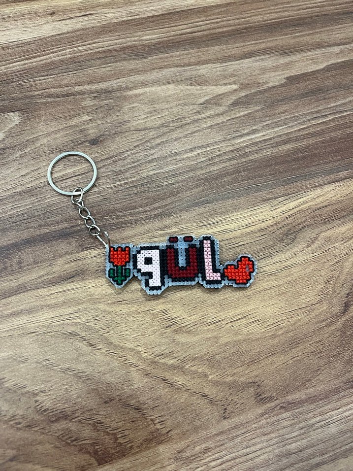 Renkli el emeği ile işlenmiş, 'gül' yazılı ve çiçek ile kalp detaylı anahtarlık. Bohem ve retro sokak stilini yansıtıyor. İstenilen isim ve modelde işlenir.