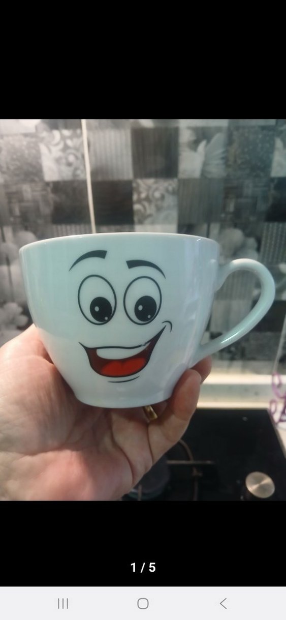 Beyaz seramik kupa, üzerinde renkli gülen yüz deseni bulunur. Rahat tutma sapına sahiptir. ☕