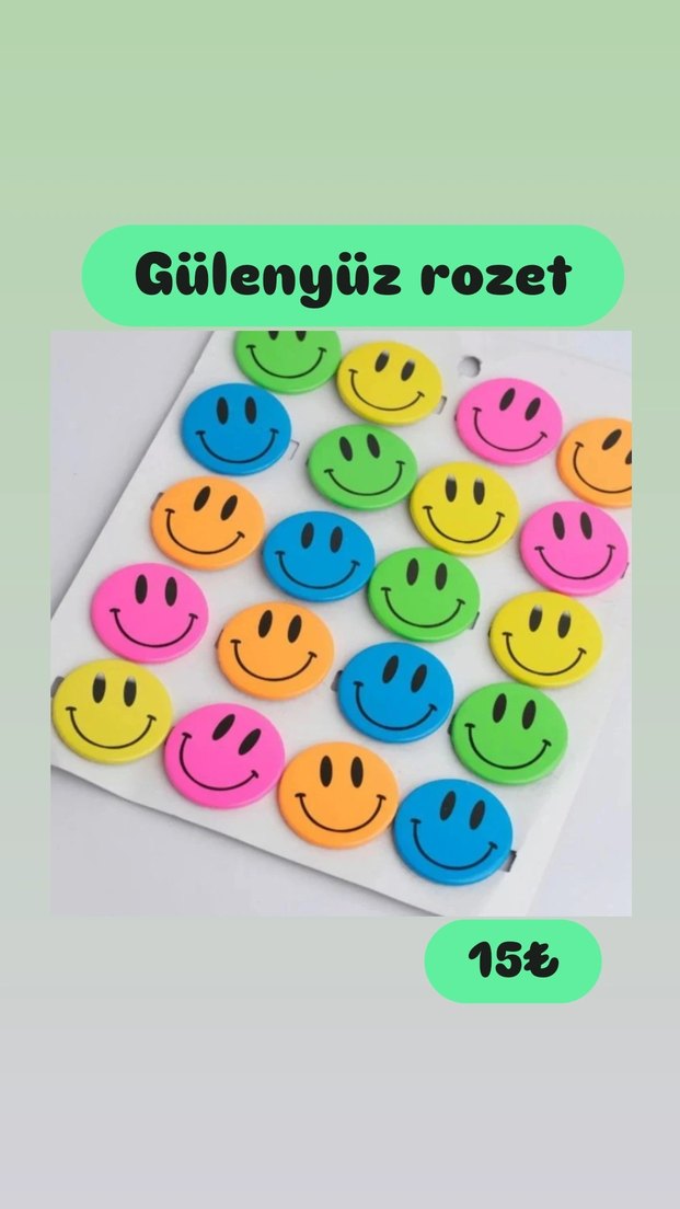 gülenyüz desenli rozetler. Her biri mutlu yüz tasarımına sahip, çocuklar için uygun. sadece sarı renk mevcuttur 2 adet fiyatıdır