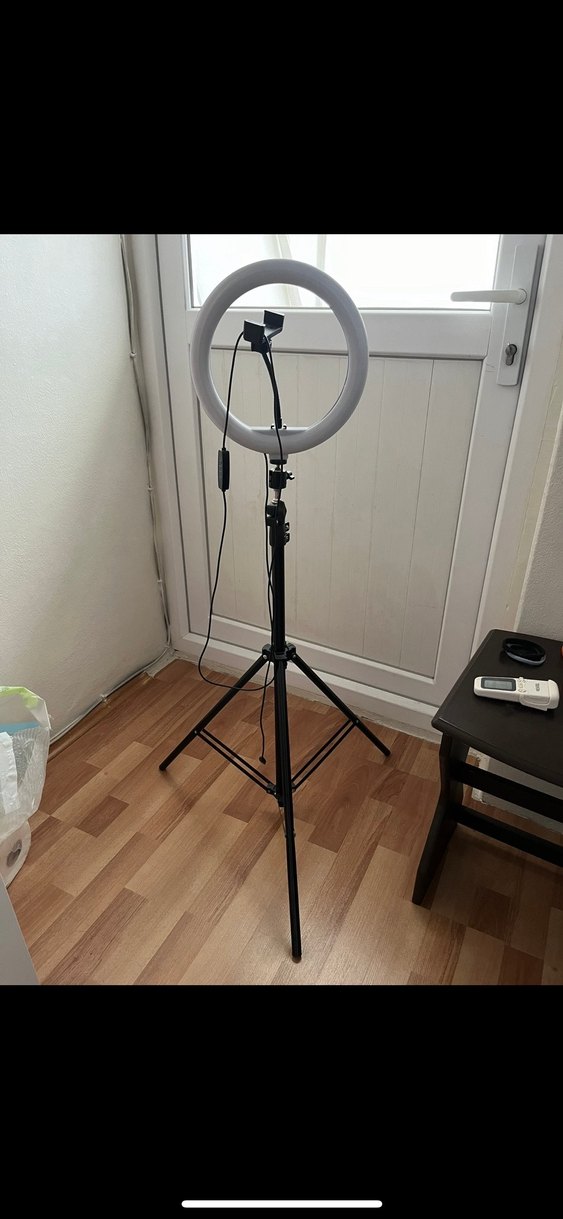 Bej renkli halka ışık, tripod stand ve telefon tutucu ile selfie ve video çekimleri için uygun. Ayarlanabilir yükseklik ve kolay kurulum.