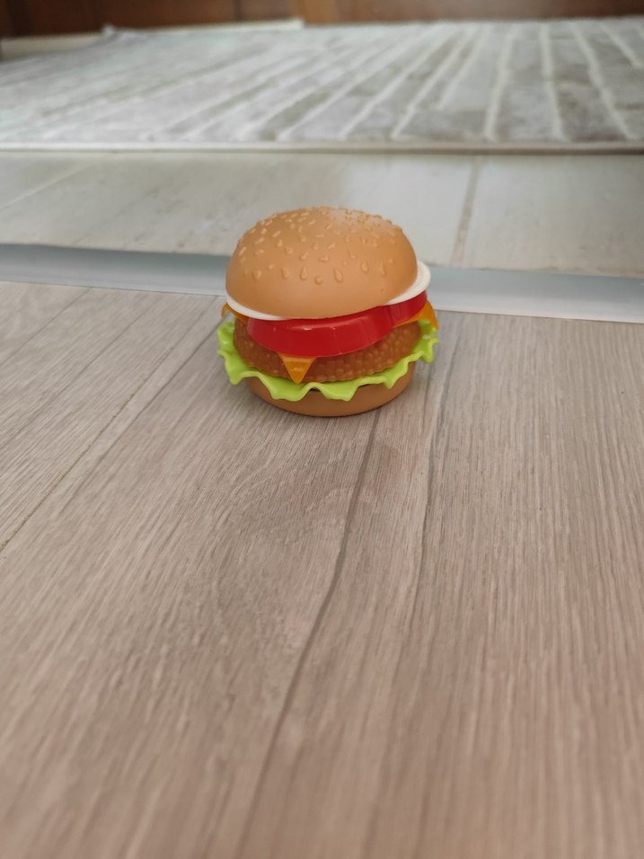 Renkli katmanlara sahip, detaylı hamburger oyuncak, içinde ekmek, marul, domates ve köfte bulunur.