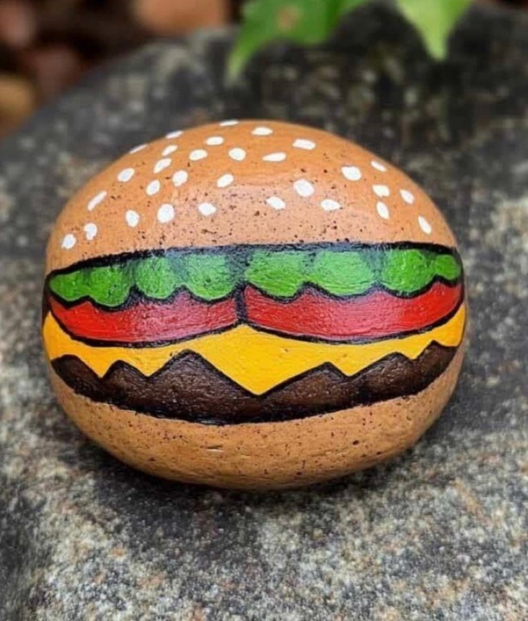 Hamburger şeklinde tasarlanmış renkli taş, dekorasyon uygulaması için eğlenceli bir seçenek sunar.