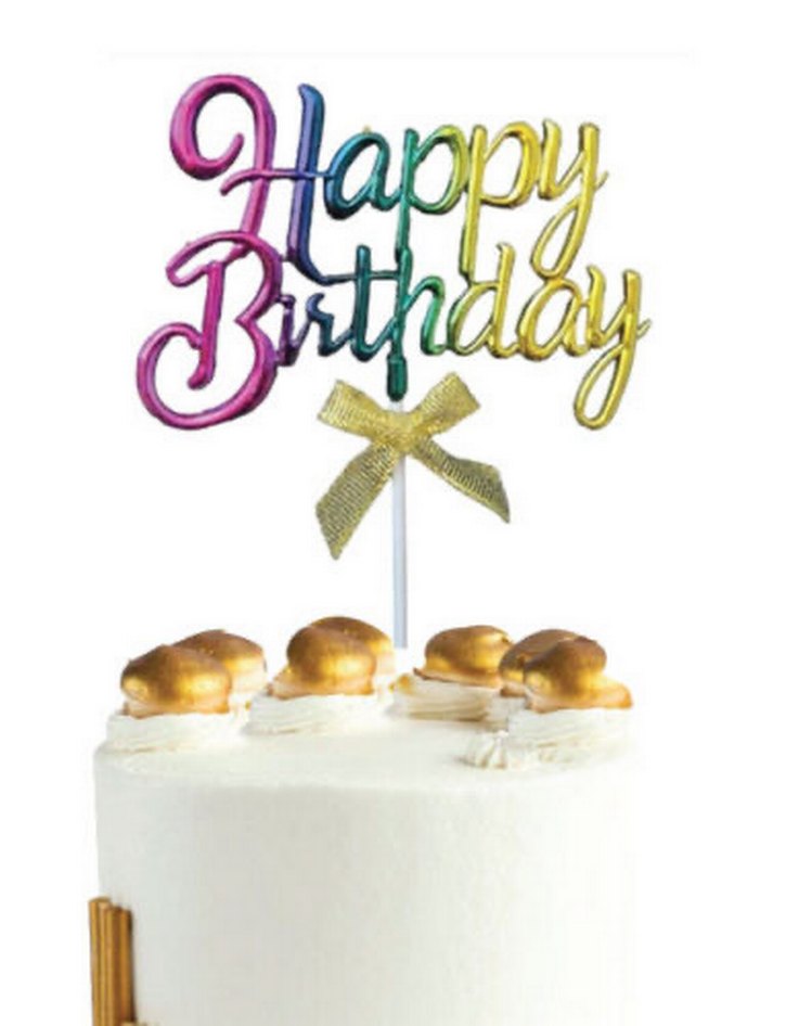 Renkli "Happy Birthday" yazılı pasta süsü, altın renkli fiyonk detaylıdır ve doğum günü kutlamaları için uygundur .