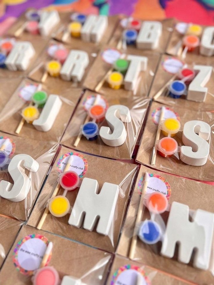 Ahşap harfler ve çeşitli renklerde küçük boya kapları içeren set. Her pakette fırça ve boyalar bulunur, okul etkinlikleri için uygundur.