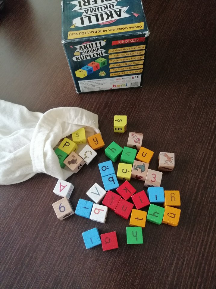 Çocuklar için harf, sayı ve resimlerin yer aldığı renkli ahşap küpler. Kolay saklama için bez çantasıyla birlikte gelir.