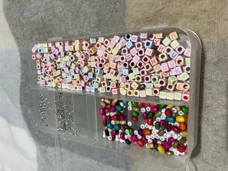 Çeşitli şekil ve renklerde, bölmeli kutuda saklanan renkli harfli tırnak süsleme boncukları. Yaratıcı tasarımlar için ideal.