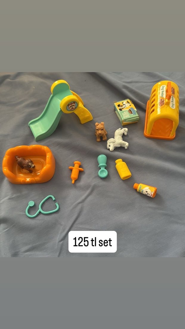 Renkli hayvan figürleri, kaydırak ve stetoskop gibi aksesuarlar içeren oyuncak seti.