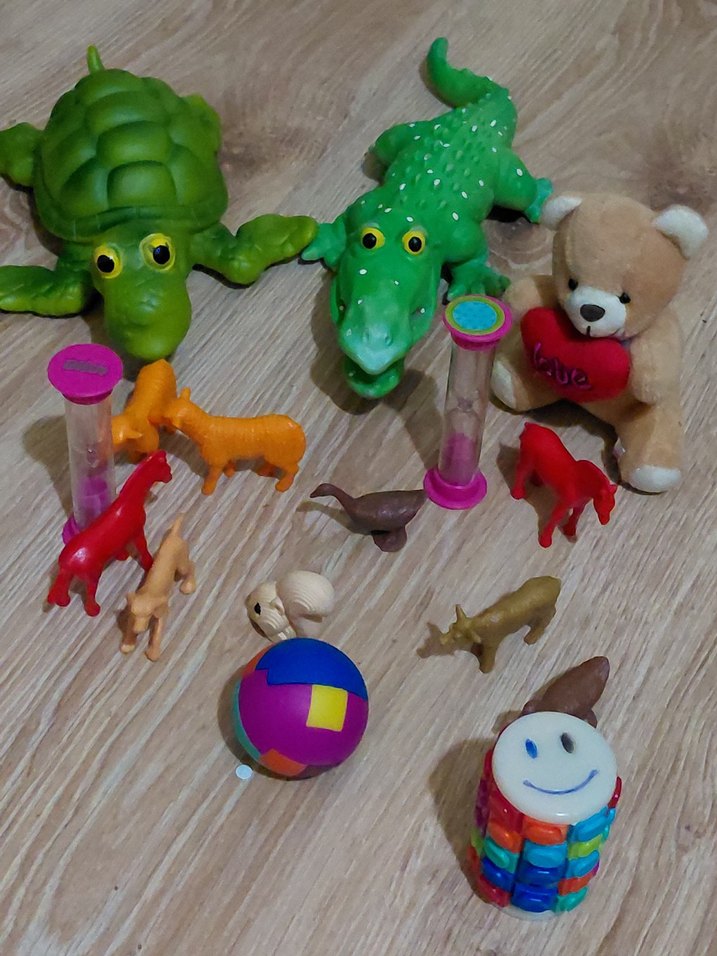 Kaplumbağa, timsah, atlar, kalpli ayıcık, renkli top ve gülen yığın oyuncak içeren renkli hayvan figürleri seti.