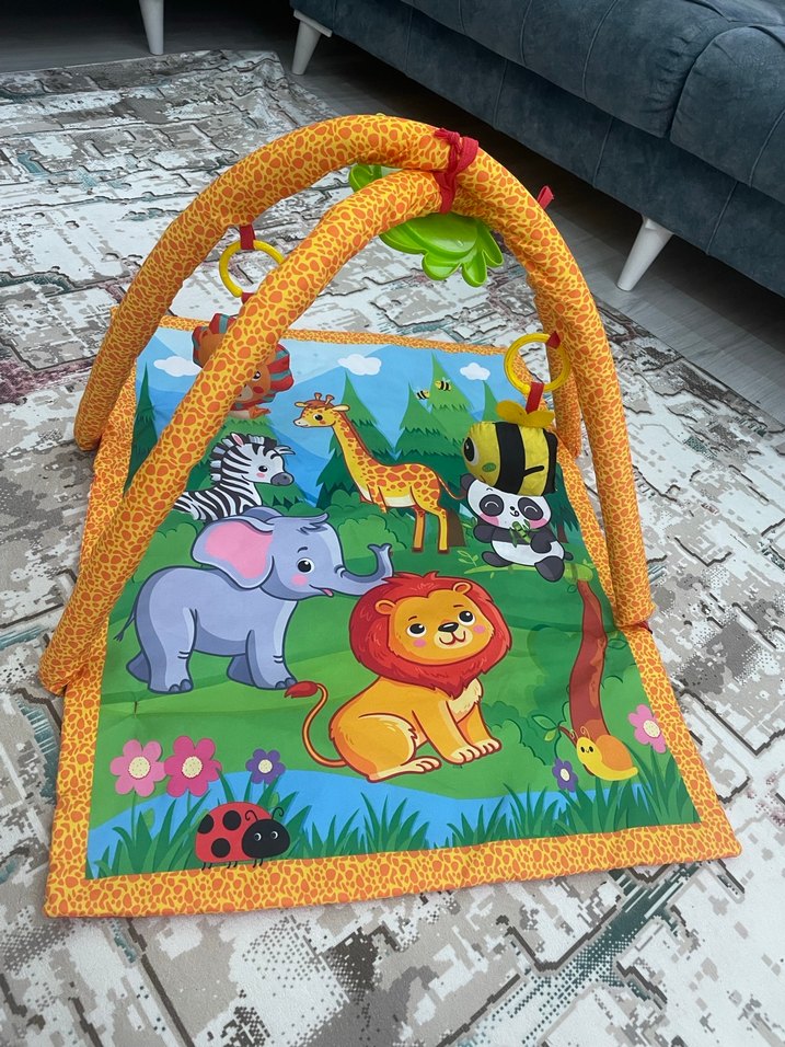 Renkli hayvan figürleriyle süslenmiş bebek oyun halısı, yumuşak sentetik kumaş ve asılı oyuncaklı kemerlerle donatılmıştır. Canlı renkli oyun halısı bir tanesi aynı olmak üzere üzerinde toplamda üç tane oyuncağı var ölçüleri resimlerde gösterilmiştir