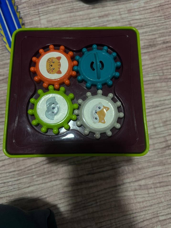 Dört farklı hayvan figürlü renkli dişlilerden oluşan eğitici oyuncak, çocukların öğrenmesini destekler.