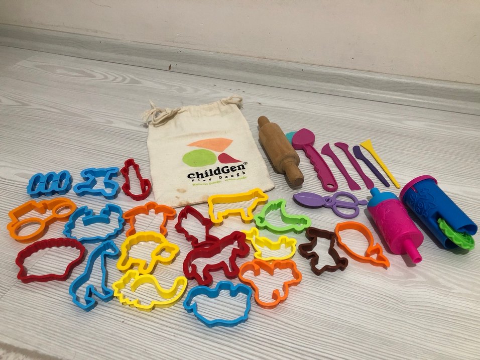 Renkli hayvan figürlü kesiciler, ahşap merdane, plastik araçlar ve saklama çantası içeren ChildGen oyun hamuru seti, yaratıcı oyun için idealdir.