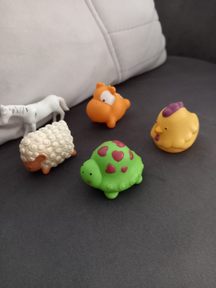 Koyun, kaplumbağa, tavuk ve su aygırı şeklinde renkli hayvan figürlü oyuncak seti. Her oyuncak canlı ve eğlenceli renklere sahip.