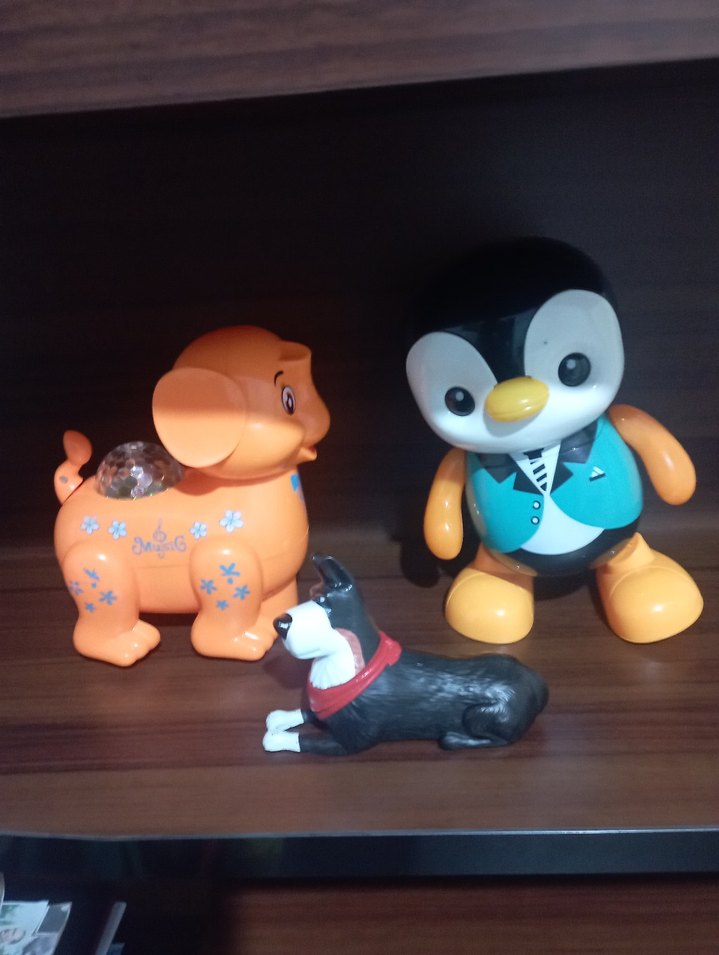Renkli ve eğlenceli tasarımlı köpek, penguen ve başka bir köpek figüründen oluşan hayvan oyuncak seti.