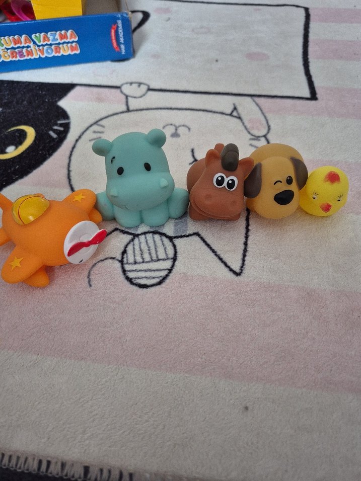Yıldız, su aygırı, at, köpek ve civciv figürlü renkli oyuncak seti. 5 adet fiyatıdır