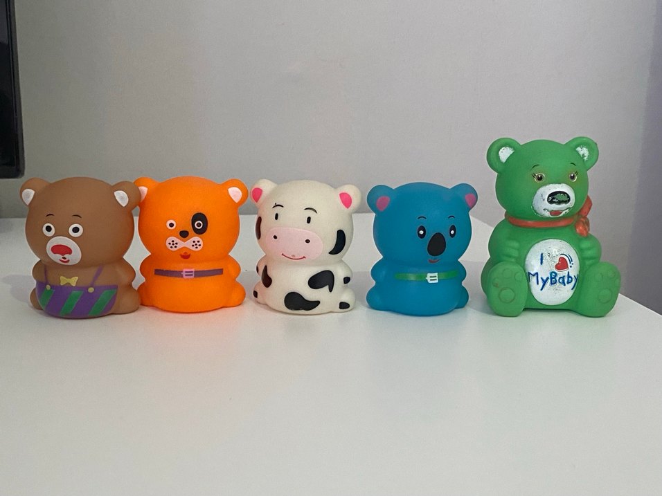 Farklı hayvan figürlerinden oluşan, renkli oyuncak seti. Bastırınca ses çıkarıyorlar.