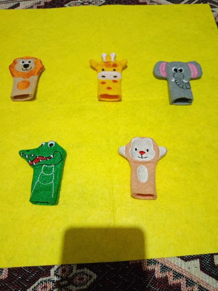 Yumuşak kumaştan yapılmış, çeşitli hayvan figürlü renkli parmak kuklaları.