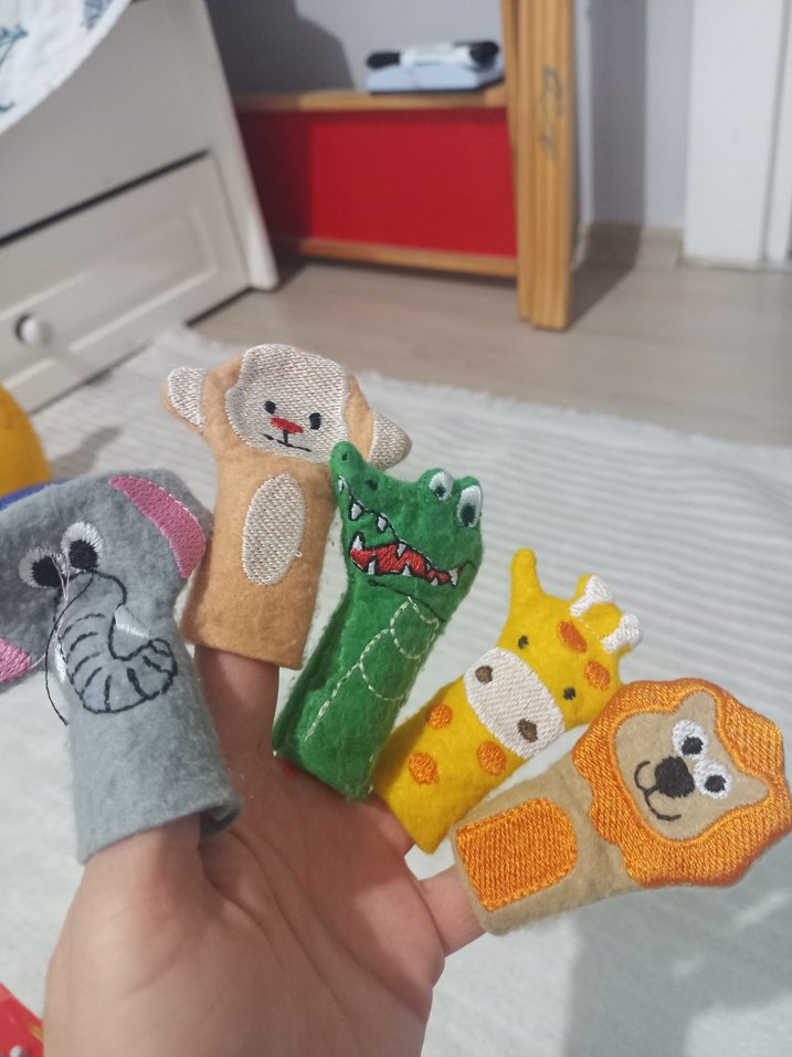 Fil, köpek, timsah, zürafa ve aslan figürlü yumuşak kumaştan yapılmış renkli parmak kuklaları.