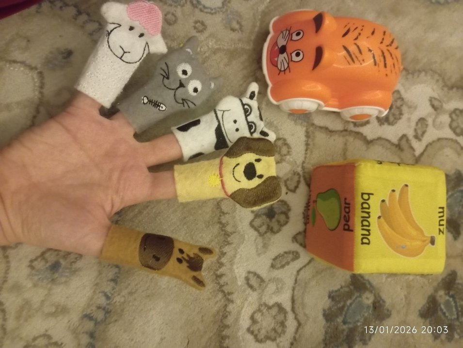 Yumuşak kumaştan yapılmış, farklı hayvan figürlerine sahip renkli parmak kuklaları. hepsinin fiyatı