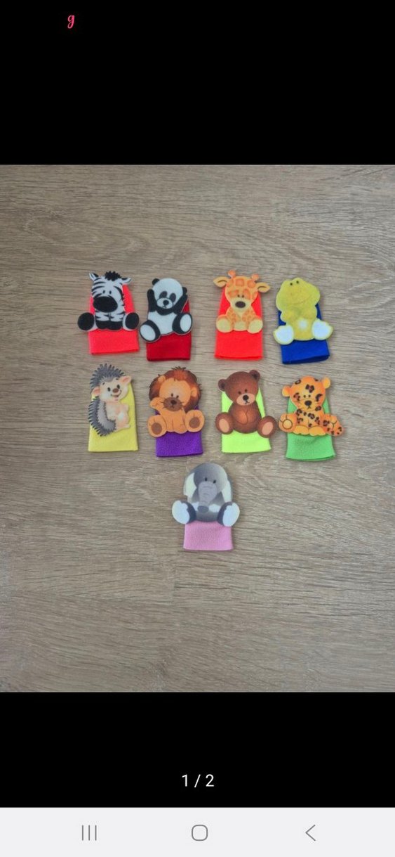 Zebra, panda, zürafa, kurbağa, kirpi, aslan, ayı, leopar ve fil gibi çeşitli hayvan figürlü renkli parmak kuklaları. Hiç kullanılmadı. Sorun yok, defo yok.