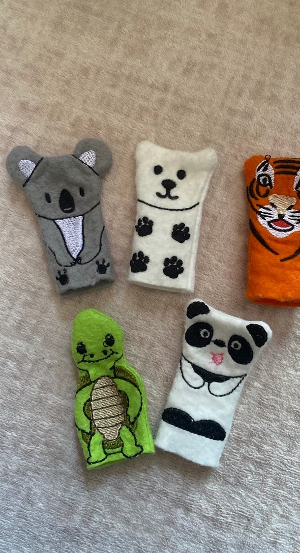Koala, ayı, kaplan, kaplumbağa ve panda gibi çeşitli hayvan figürlü renkli peluş parmak kuklaları. Yumuşak kumaştan yapılmıştır.