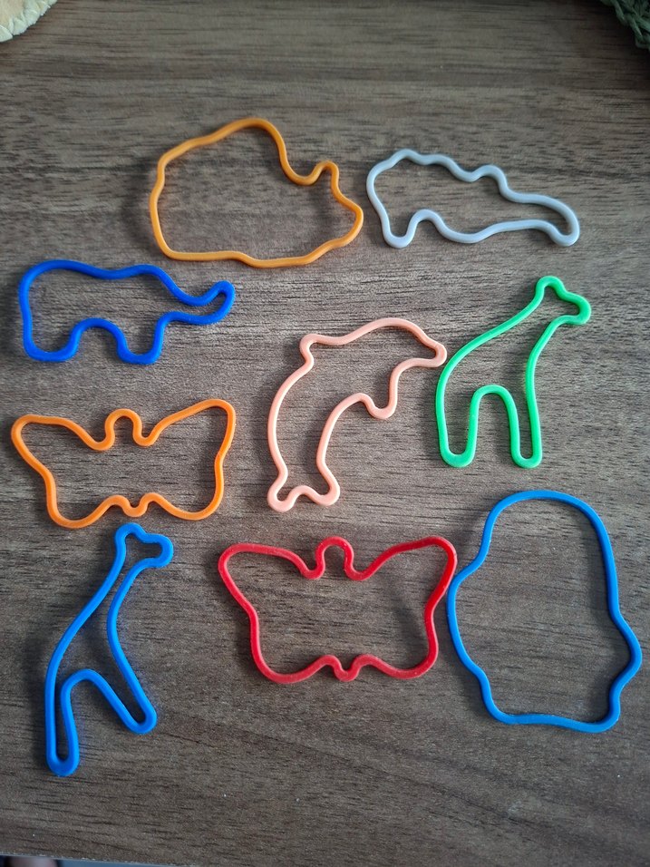 Kelebek, zürafa, yunus gibi hayvan figürlü renkli silikon lastikler. Esnek ve eğlenceli çocuk aksesuarları.