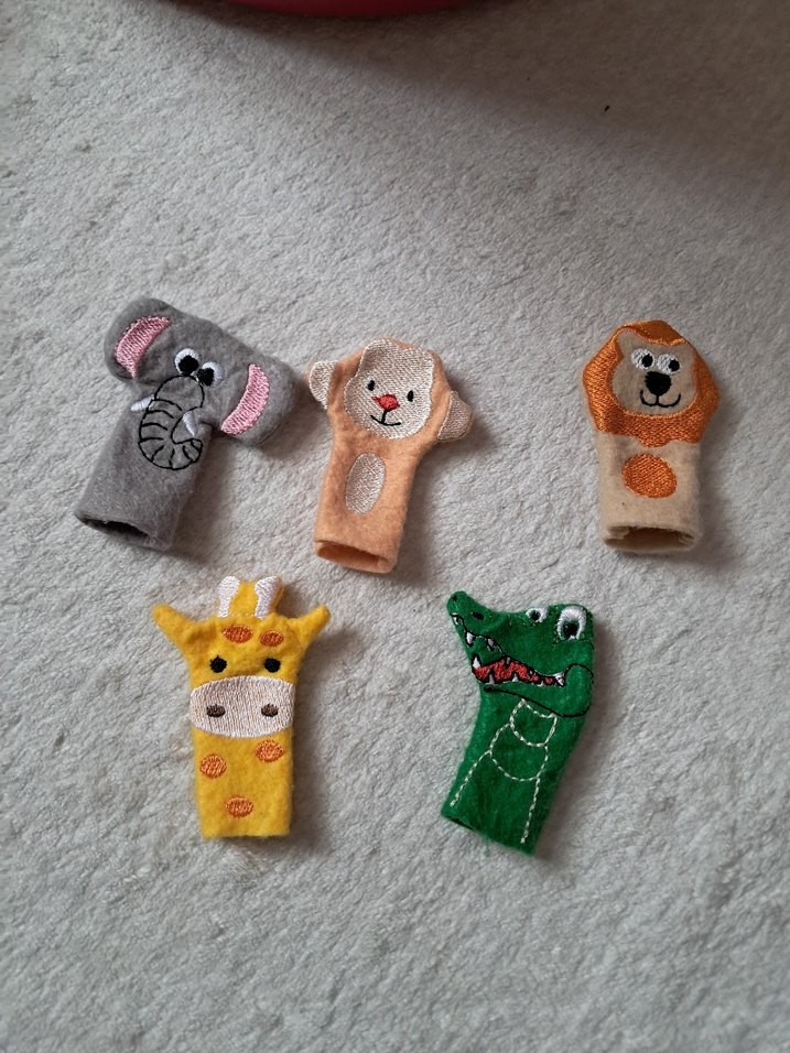 Fil, ayı, aslan, zürafa ve timsah figürlü renkli parmak kuklaları seti. Yumuşak kumaştan yapılmıştır.