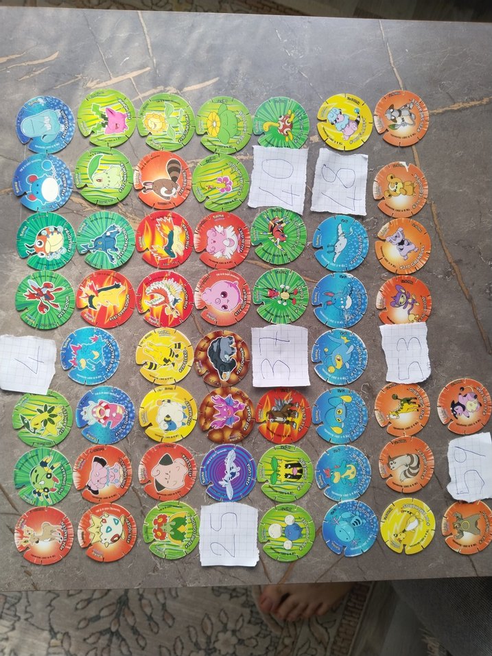 Çeşitli çizgi hayvan figürleri ve sayılar içeren renkli, yuvarlak oyun pulları.