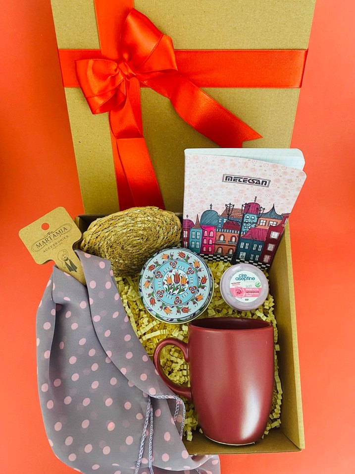 Renkli hediye kutusunda pembe seramik kupa, desenli defter, puantiyeli fular ve küçük aksesuar kutuları bulunuyor. Kırmızı kurdele ile paketlenmiştir .