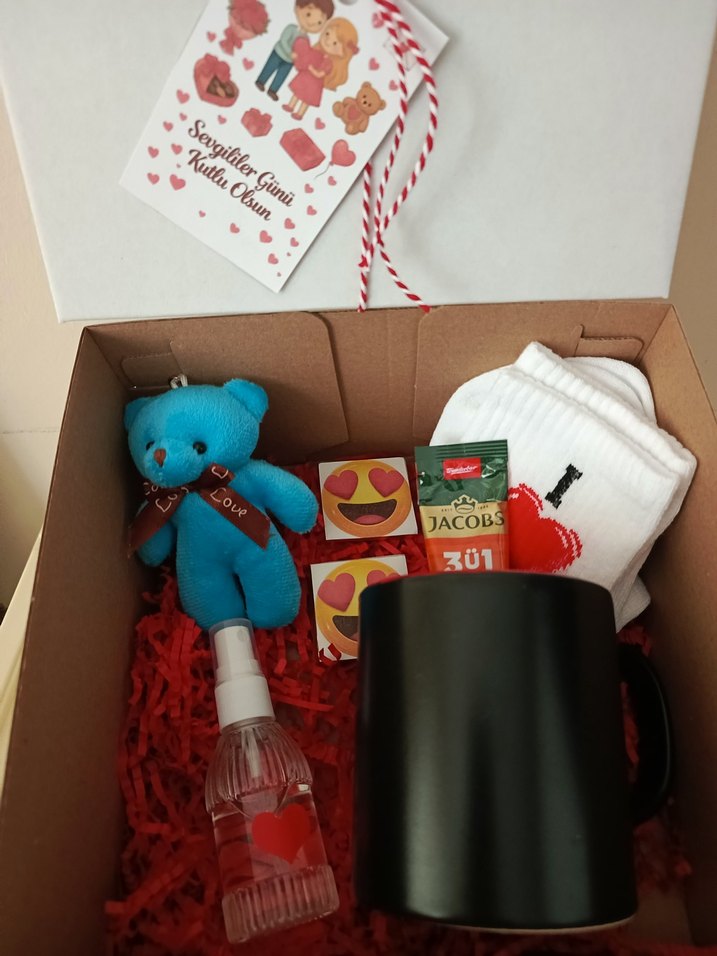 Renkli hediye kutusunda mavi ayıcık, siyah kupa, beyaz çorap, "301 JACOB" etiketli kahve paketleri, emoji temalı çikolatalar ve küçük sprey şişesi bulunur. Sevgililer Günü etiketi ile gelir. ❤️