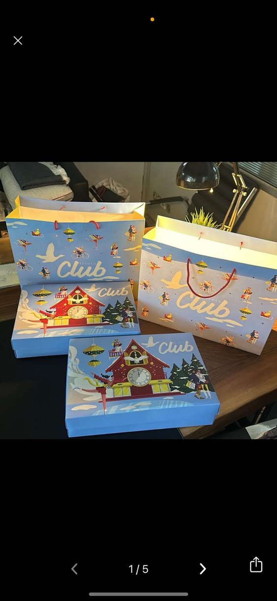Kış temalı saatli kule ve uçan figürlerin yer aldığı renkli hediye kutusu ve çantası seti .sadece 1 adet karton poşet var