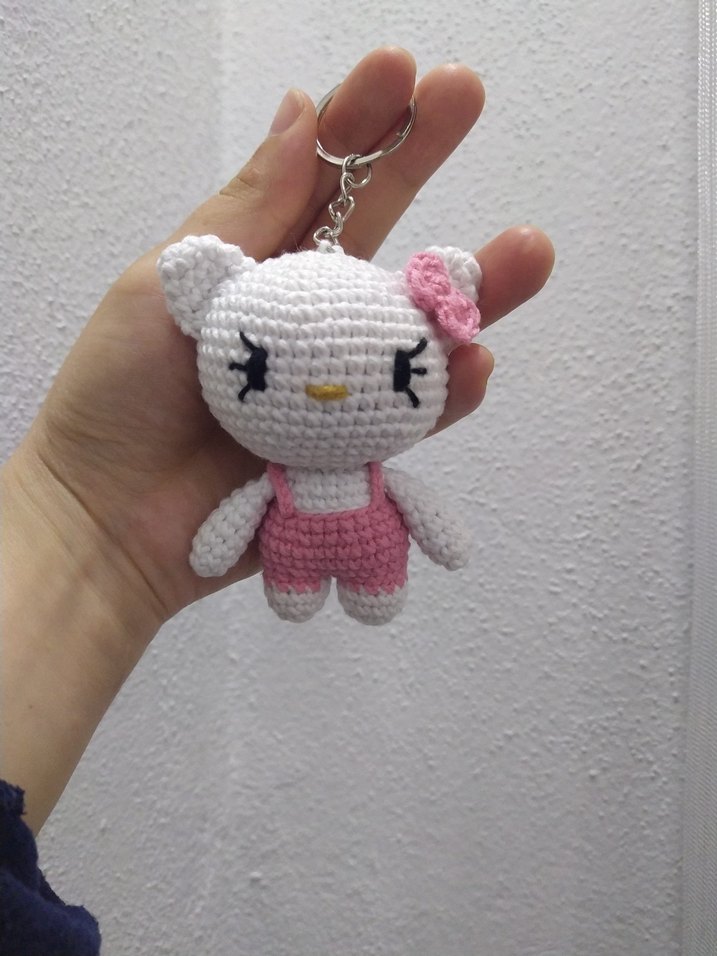 Renkli örgüden yapılmış, pembe kıyafetli rahat ve sade tarzda kedi figürlü anahtarlık. istenilen renk yapılır