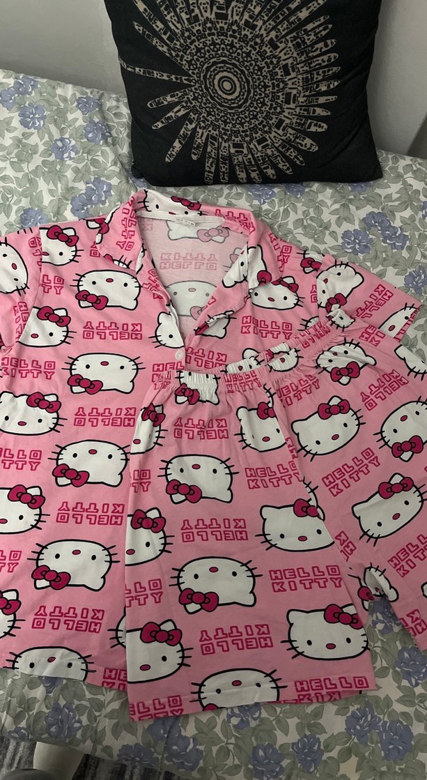 Renkli pembe tonlarında, kısa kollu ve midi boyda, bol kesim kadın pijama takımı. Üzerinde çeşitli Hello Kitty baskıları bulunur, rahat ve sokak stilinde bir tasarımdır.