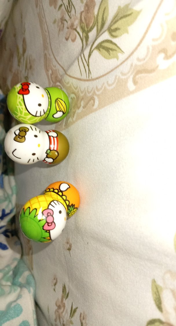 Canlı desenlere sahip renkli Hello Kitty figürleri. Her figür farklı tema ve parlak renklere sahiptir.