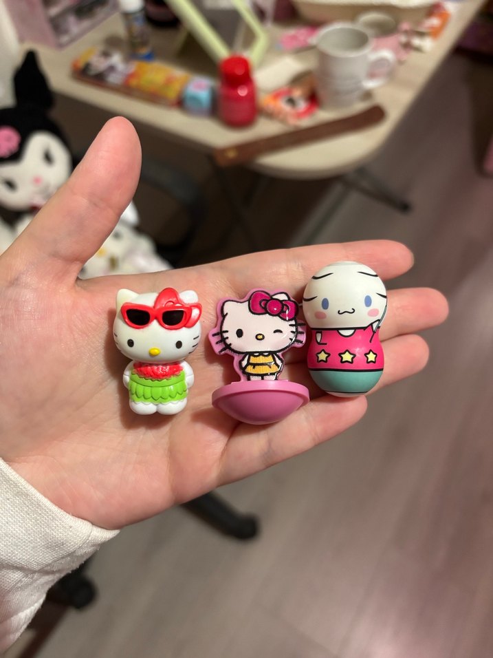 İki renkli pembe Hello Kitty figürü, farklı kıyafet ve aksesuarlara sahip. Koleksiyon veya hayranlar için uygun. Biri yaz temalı hacıyatmaz şeklindedir biri de figür şeklinde. Bir adet de Cinnamoroll hacıyatmaz. Sanrio Kuromi My Melody