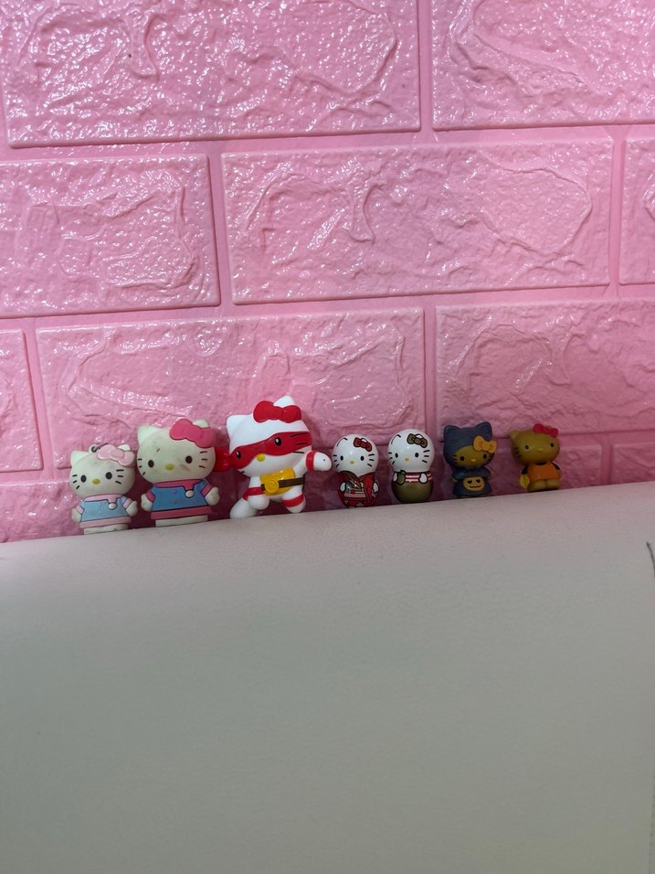 Farklı tarz ve pozisyonlarda renkli Hello Kitty figürleri seti. Koleksiyoncular ve hayranlar için uygundur.