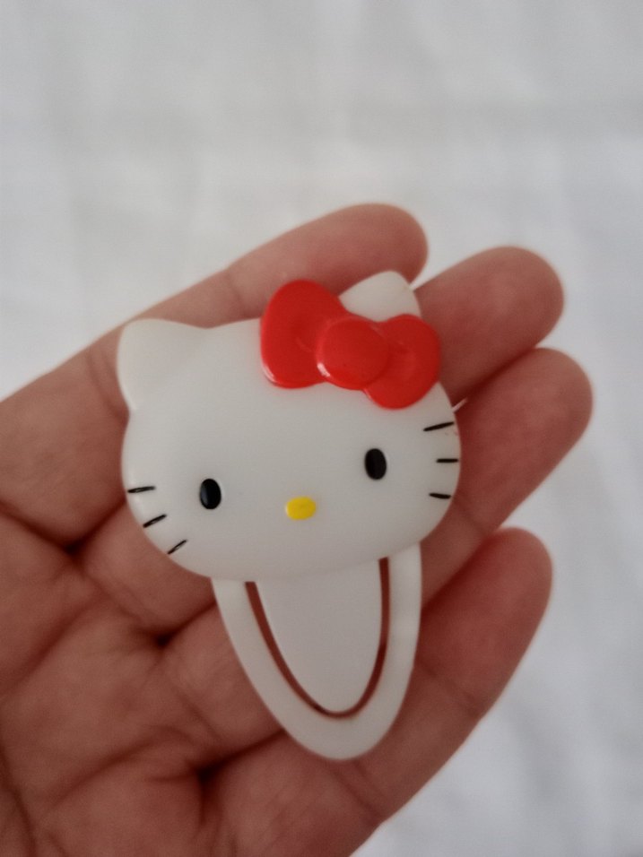 Hello Kitty figürlü, beyaz ve renkli, kırmızı fiyonk detaylı klips. Dekoratif aksesuar olarak kullanılabilir.