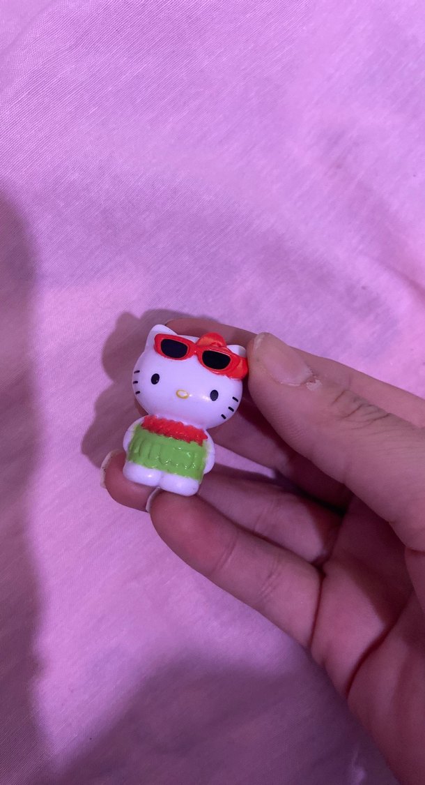 Kırmızı güneş gözlüğü ve yeşil etekli renkli Hello Kitty figürü. Elinizde rahatça tutabilirsiniz, pembe arka planla uyumlu.