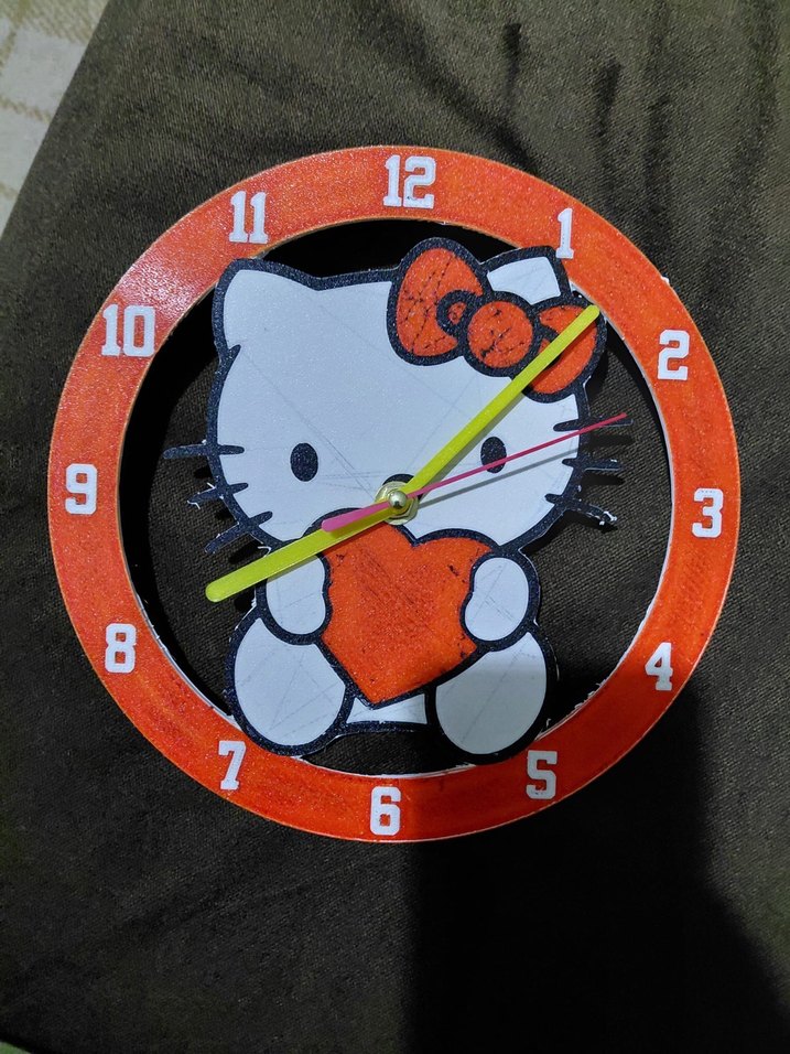 Turuncu çerçeveli, kalp tutan Hello Kitty figürlü renkli duvar saati. Beyaz sayılar net şekilde yer alır.