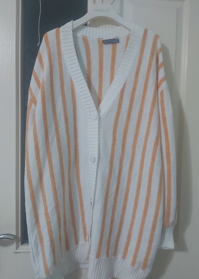 Turuncu beyaz çizgili beyaz düğmeli hırka kol boyu 56 cm boyu 83 cm eni 58 cm