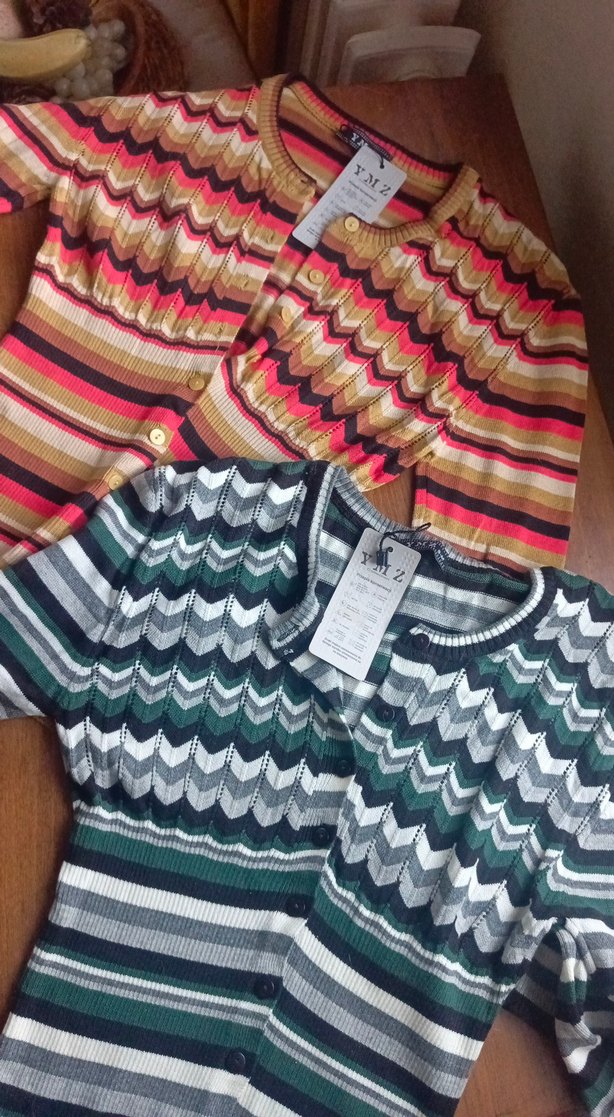 Renkli desenli sıfır yaka, hiç giyilmedi, S-M bedene uygun, bedene oturan lycra triko hırkalar. 2 farklı renk, tane fiyatıdir.