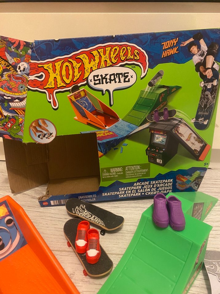 Canlı renklerde Hot Wheels kaykay oyuncak seti, mini kaykaylar ve kaykay rampaları içerir. Küçük ayakkabılar ve arcade teması bulunur.