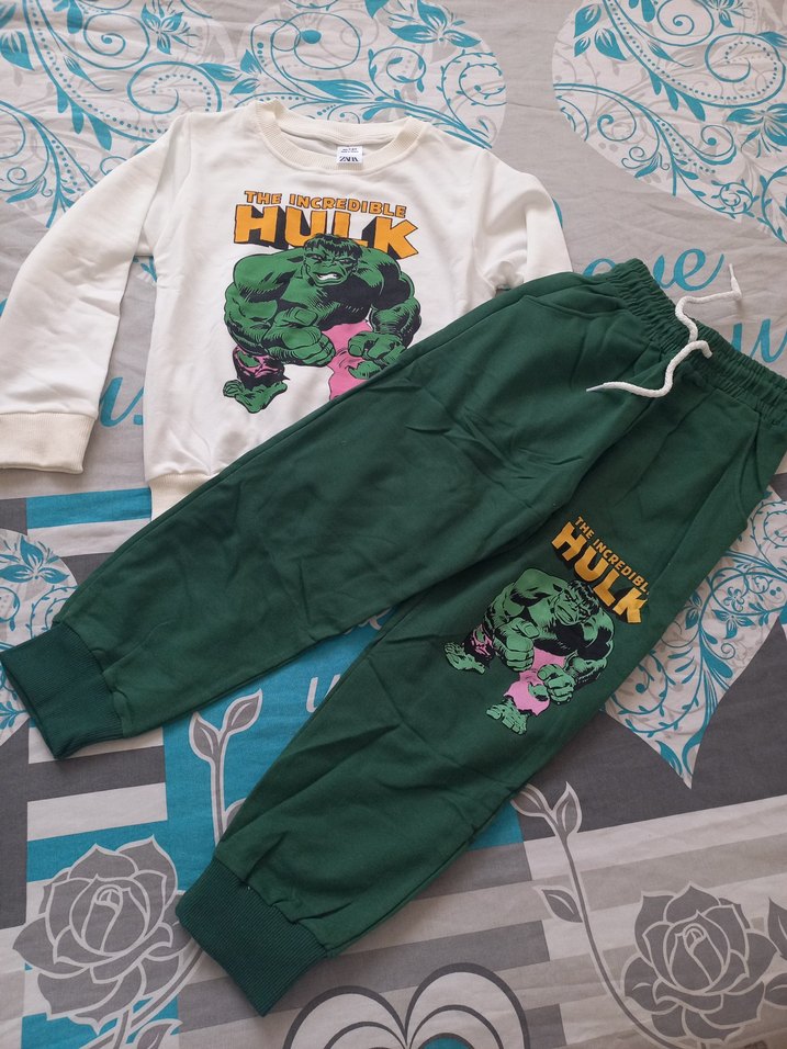 etiketli Pamuklu, bol kesim, renkli Hulk baskılı erkek çocuk eşofman takımı. Crew neck sweatshirt ve fermuarlı yeşil pantolon içerir. ♂️