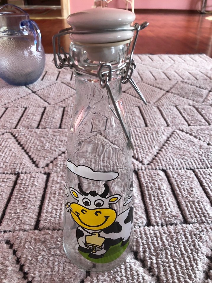 Bu cam biberon üzerinde renkli inek figürü ve beyaz metal kapak bulunur.