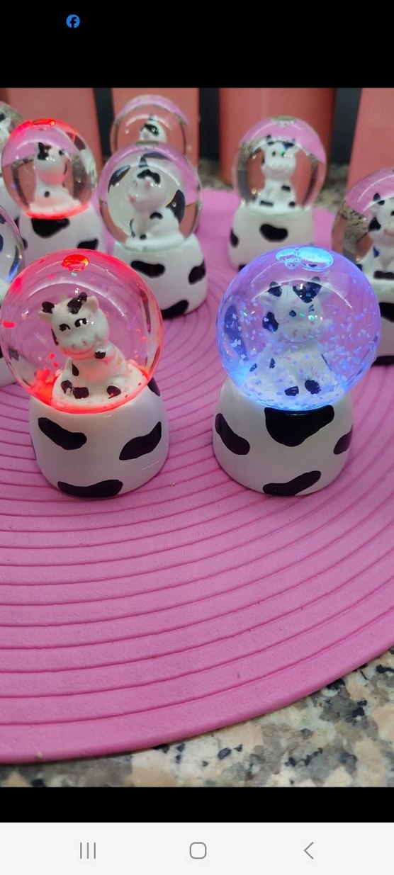 Işık efektli, siyah beyaz benekli tabanlı ve içinde küçük inek figürü bulunan renkli kar küresi bibloları.