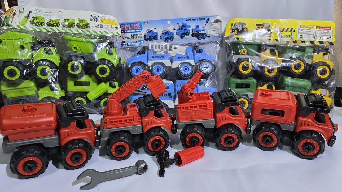 Çıkarılabilir parçalar ve montaj araçları ile renkli oyuncak inşaat araçları seti.