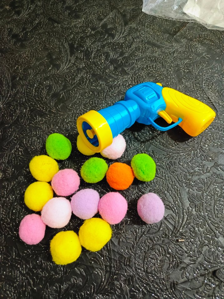 Mavi ve sarı renklerde, rahat tutuşlu oyuncak tabanca ve çeşitli renklerde yumuşak toplar içerir. kedi oyunları