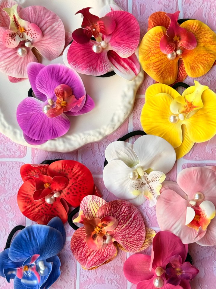 Renkli ipek çiçek tasarımlı, elastik bantlı saç tokaları. Bohem ve retro tarzda, pop kültür esintili.